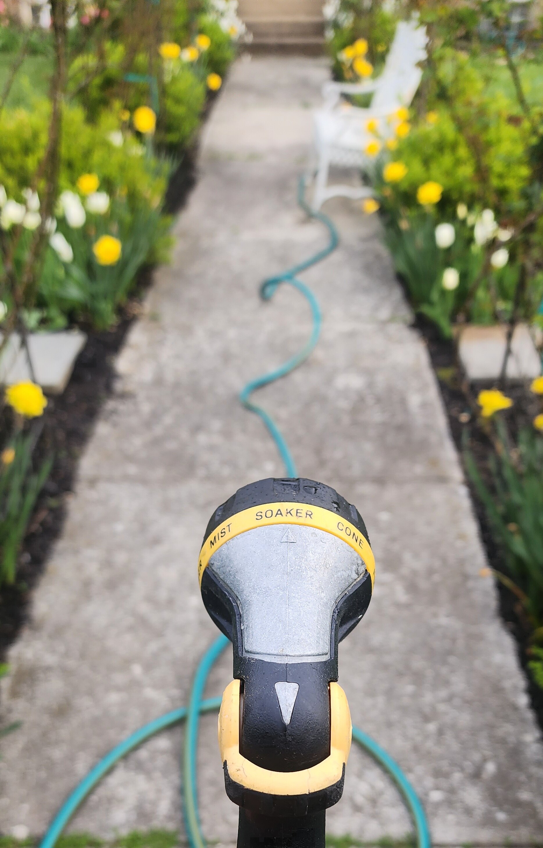 If you are watering by hand, use a hose attachment with a soaker setting such as I have in the photo below. Set it at the base of your trees and shrubs and let it run for several minutes depending on the size of plant. For reference, 3-5 minutes should be OK for a Skip Laurel depending on it’s size and location. Set on the soaker setting, my garden hose can fill a 5-gallon bucket in 1 minute 30 seconds. Try your hose out and adjust watering time accordingly.